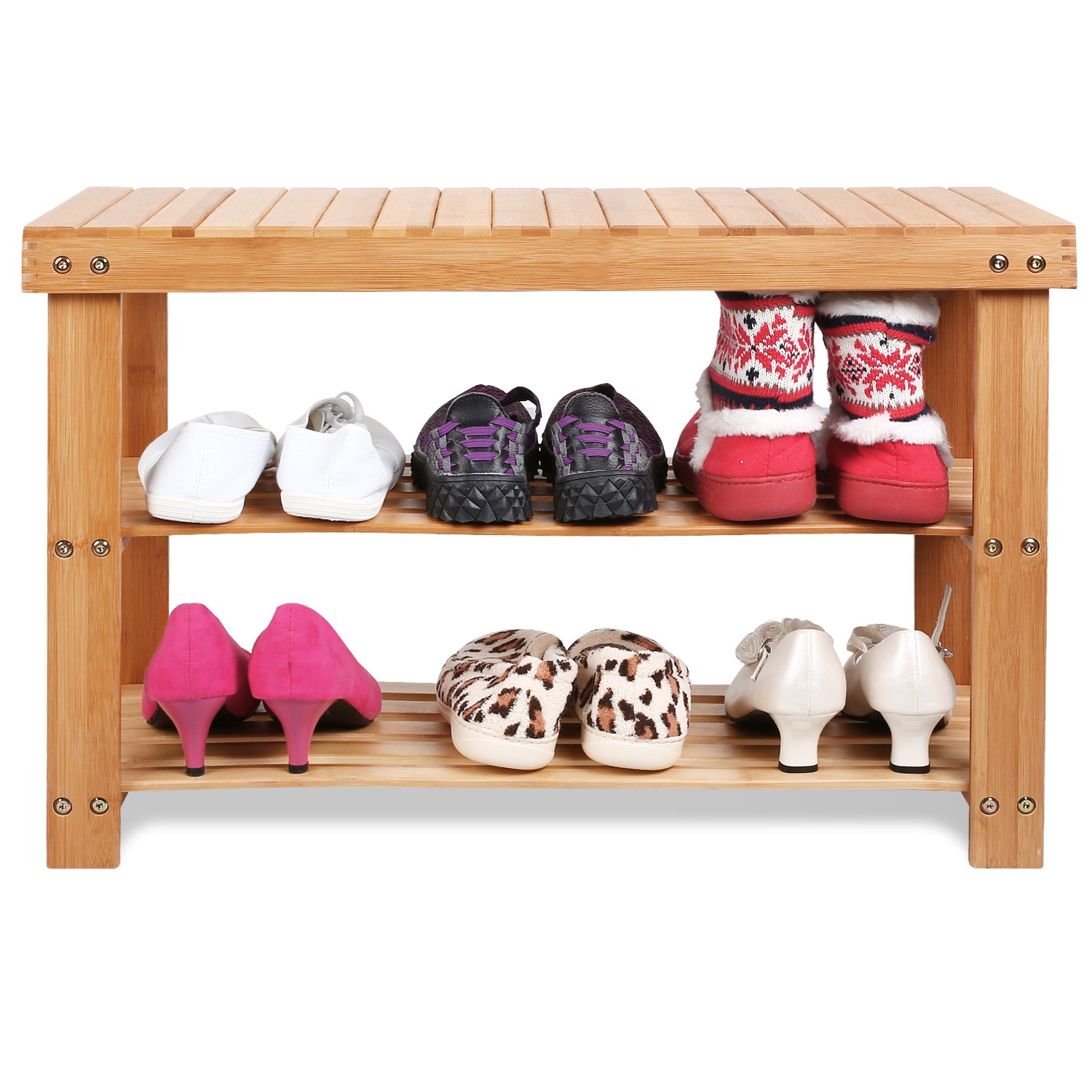 天然竹製成,堅固耐用,無毒環保,適用光滑的表面,隱藏式螺絲孔和圓角,提供安全的環境。鞋架與板凳的結合,有助於節省空間,適合放在玄關、陽台、客廳、臥室等,產品尺寸