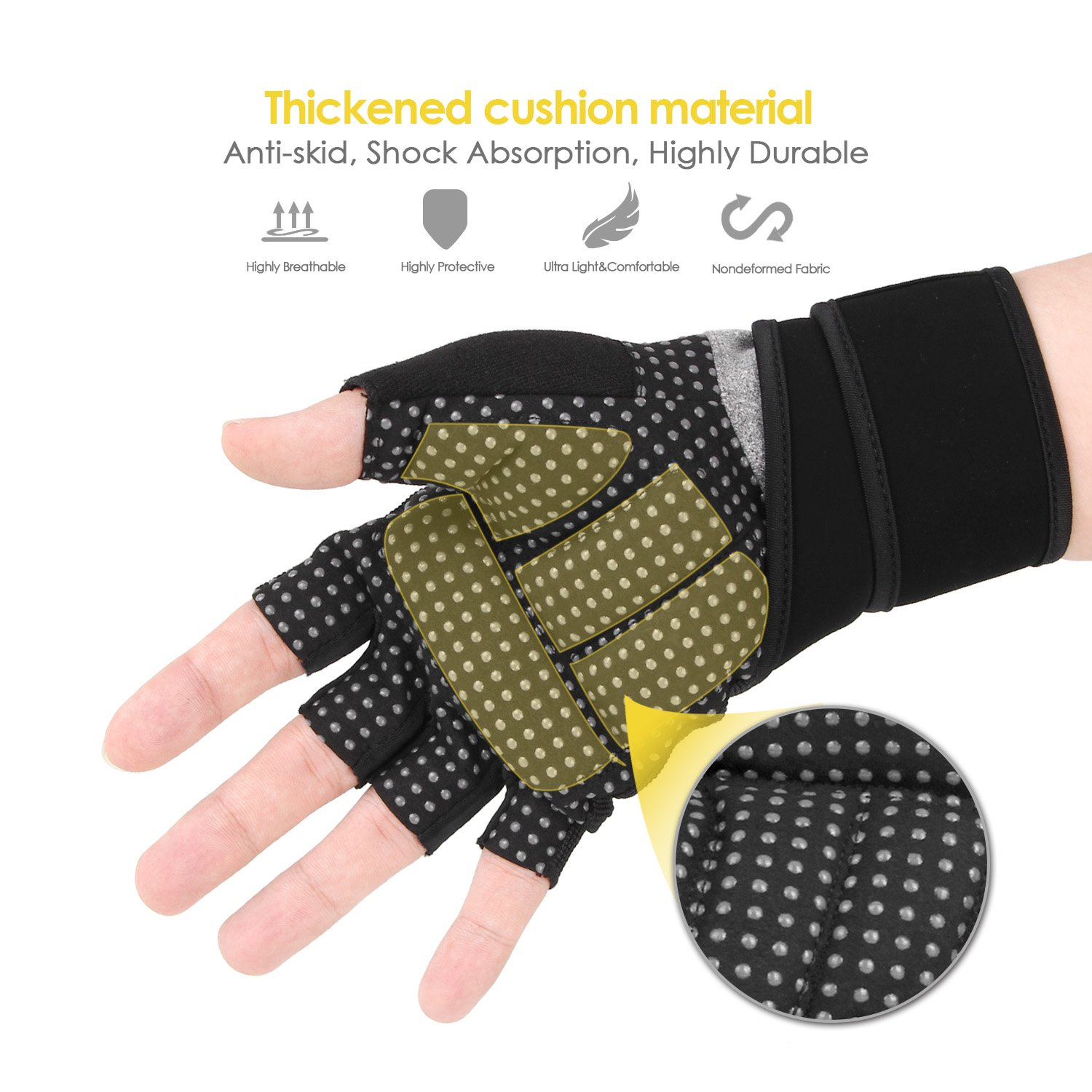 此款手套材質在進行舉重時,提供額外的抓力和防滑功能。在強力訓練期間,可以提高整體訓練效率,特別設計加厚的手掌墊主要是當你拿著啞鈴或做上推時,增加額外的抓力,還能為你帶來全新的訓練體驗。手套背面的半指設計和高度透氣的面料有助於排汗,使手套在高強度運動時不會鬆動,提供