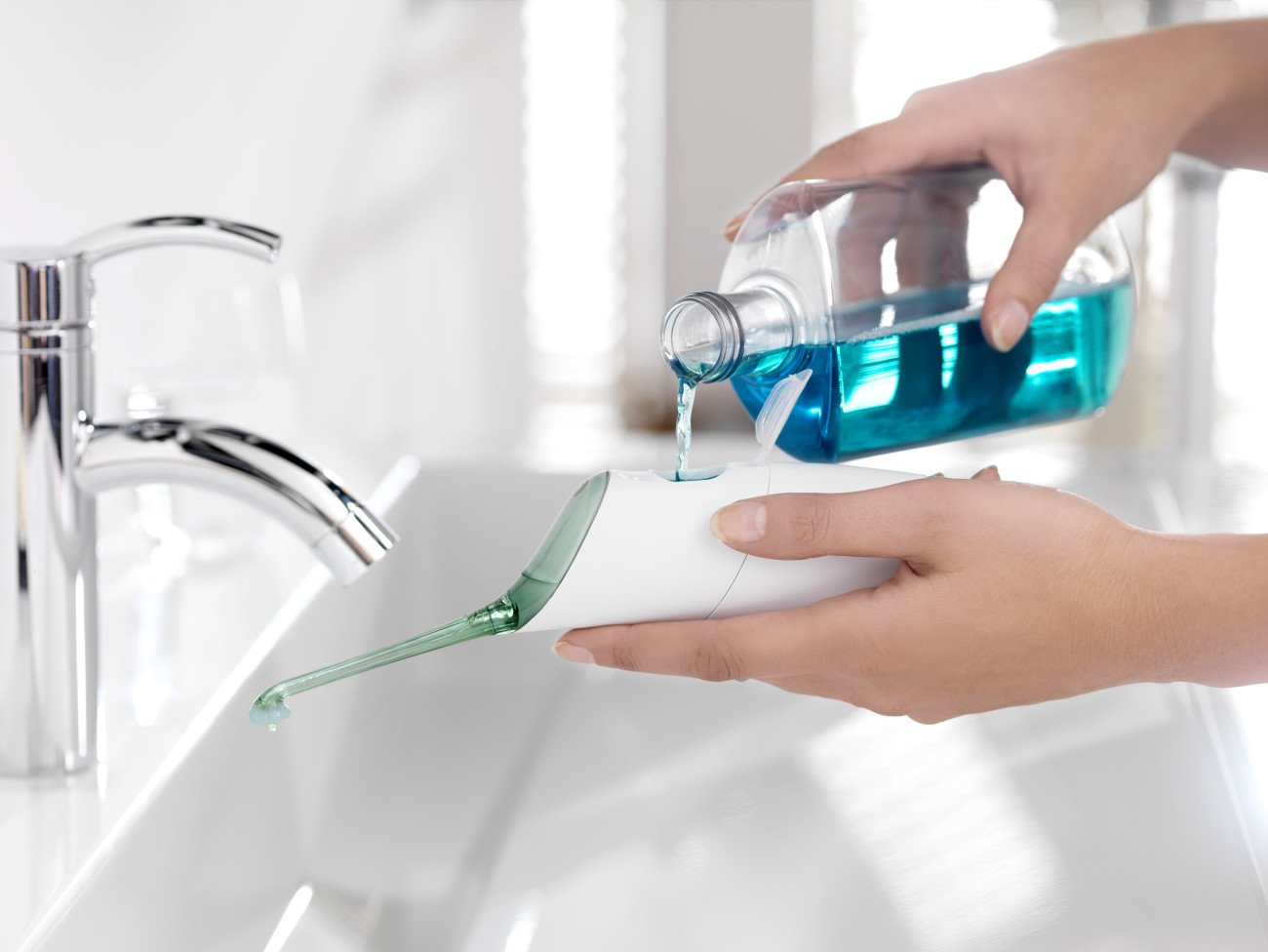 此款使用空氣牙線技術,可搭配水或漱口水使用。採用了